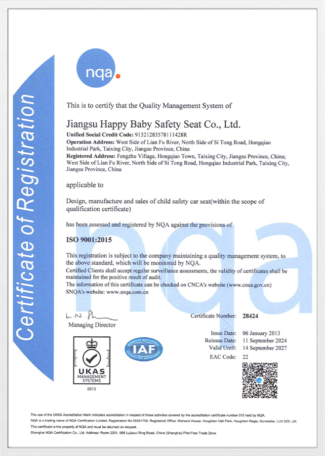 Tá an Suíochán I-Méid is catagóir sonrach é laistigh de rialachán R129. Léiríonn sé an leibhéal comhoiriúnachta agus sábháilteachta is airde sa mhargadh reatha. Ag Jiangsu CO Suíochán SÁBHÁILTEACHTA BABY HAPPY, TEO. , Cinntíonn ár bpróiseas T & F go bhfuil gach Suíochán I-Méid trí mhaoirseacht dhian agus leanúnach Tástáil fhisiceach agus cheimiceach .